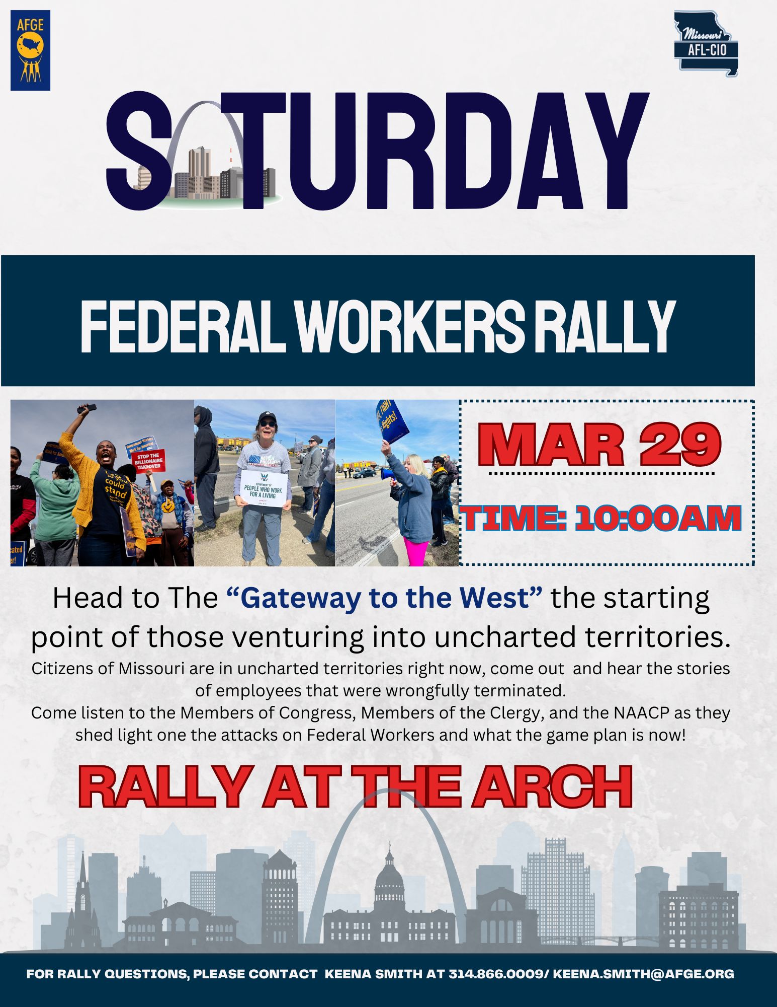 Events Rally at the Arch to Support Federal Workers March 29, 2025 11:00AM - 1:00PM Located in:Gateway Arch National ParkAddress:St. Louis, MO 63102 Social share icons