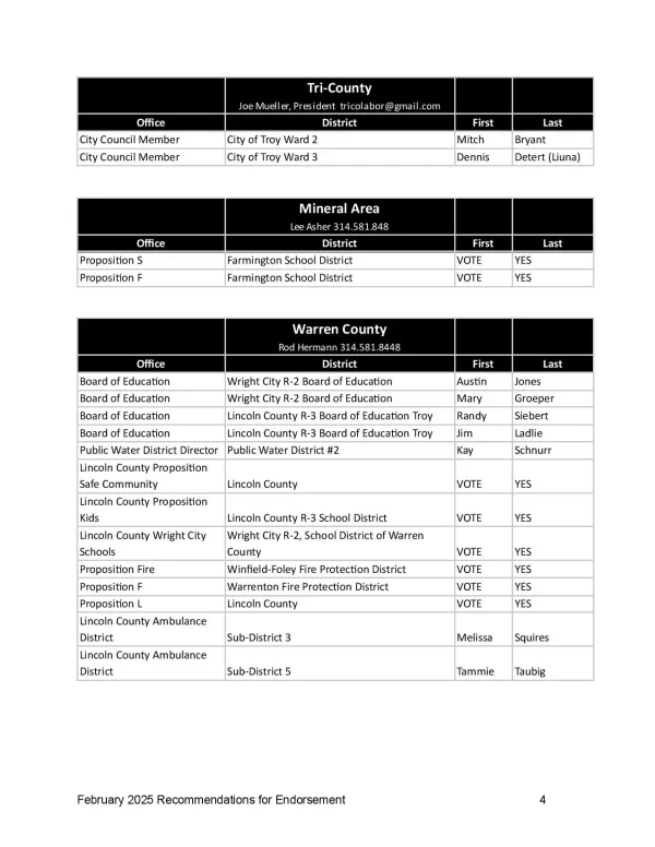 News Greater St. Louis Labor Council Delegates Add to Spring Endorsements Luke Canfora 02 Mar, 2025 Social share icons DOCUMENT february_2025_endorsements_-_google_docs.pdf Mar 2, 2025february_2025_endorsements_-_google_docs.pdf